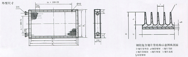 外径D(mm) 翅片高度h(mm) 翅片厚度s(mm) 翅片节距t(mm) 铝管壁厚h(mm) 钢管壁厚h(mm) 总外表面积Sw(m2/m) 铝管壁厚